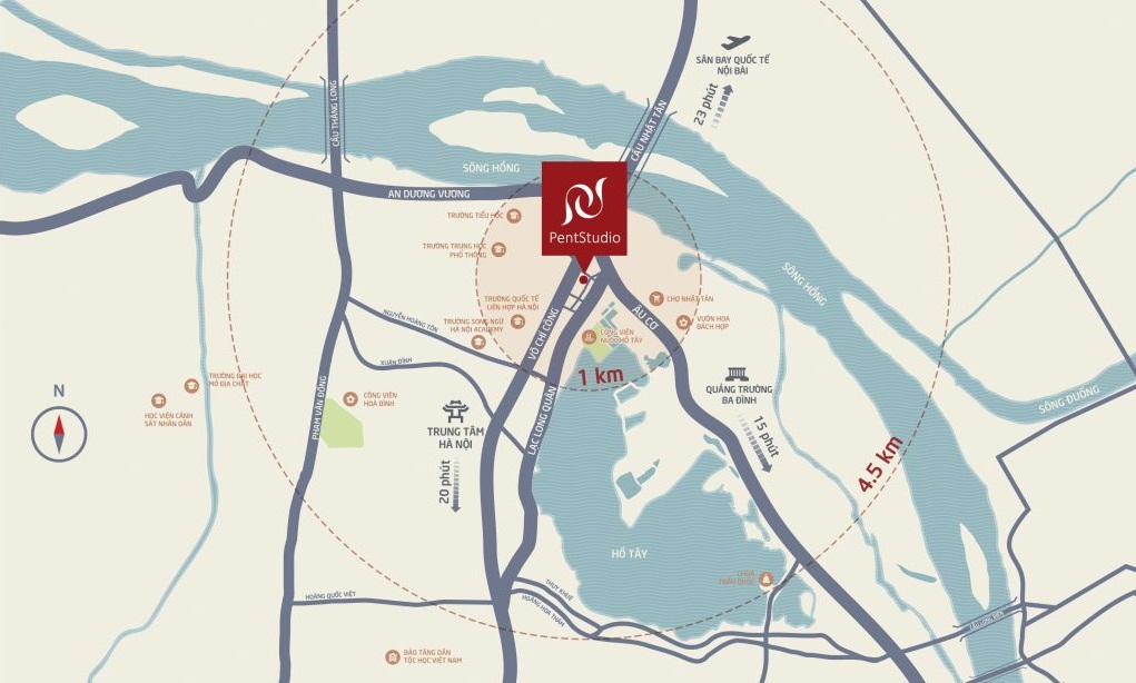 Pent Studio tọa lạc tại số 699 đường Lạc Long Quân nằm ngay sát cầu Nhật Tân và Hồ Tây. Chỉ mất 3 phút đi bộ để ra đến Bờ Hồ, 20 phút để đi đến sân bay quốc tế Nội Bài hay quảng trường Ba Đình; 15 phút để đi đến công viên Hoà Bình; và không tới 10 phút để đi đến trường quốc tế Liên Hợp Quốc, bệnh viện quốc tế SOS Hà Nội, hoặc cầu Nhật Tân. PentStudio có lợi thế lớn về giao thông cũng như không gian yên tĩnh giữa Hà Nội ồn ào náo nhiệt.