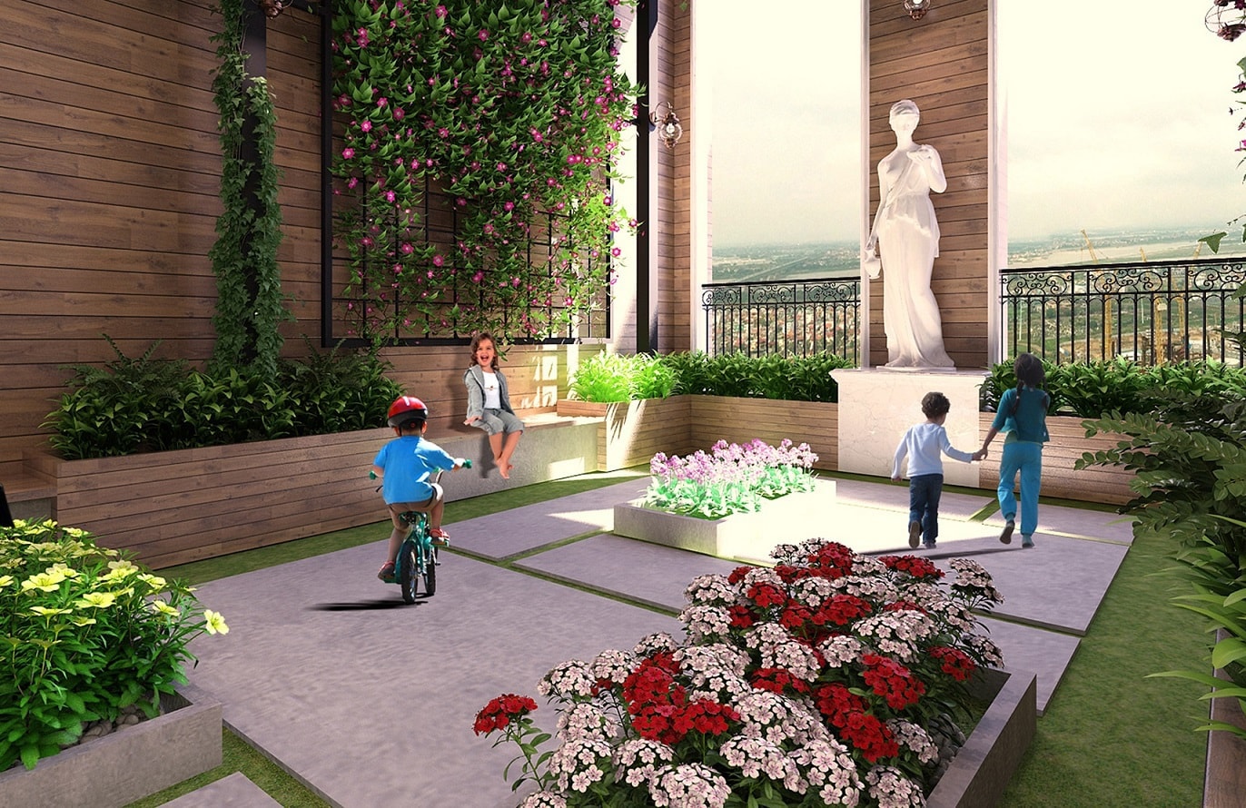 Yếu tố cảnh quan được đặc biệt chăm chút ở Dự án Sunshine Global Tây Hồ Những đài phun nước, tượng tứ mã biểu tượng của may mắn - tài lộc hòa quyện cùng cây lá và sắc hoa tươi tắn. Màu xanh bình yên hiện diện ở hầu khắp mọi nơi, không chỉ ở dưới mặt đất, quanh bể bơi, trong sân chơi của trẻ mà còn điểm xuyết trên các ban công và những khu vườn xinh xắn ở những căn penhouse trên đỉnh cao tòa tháp