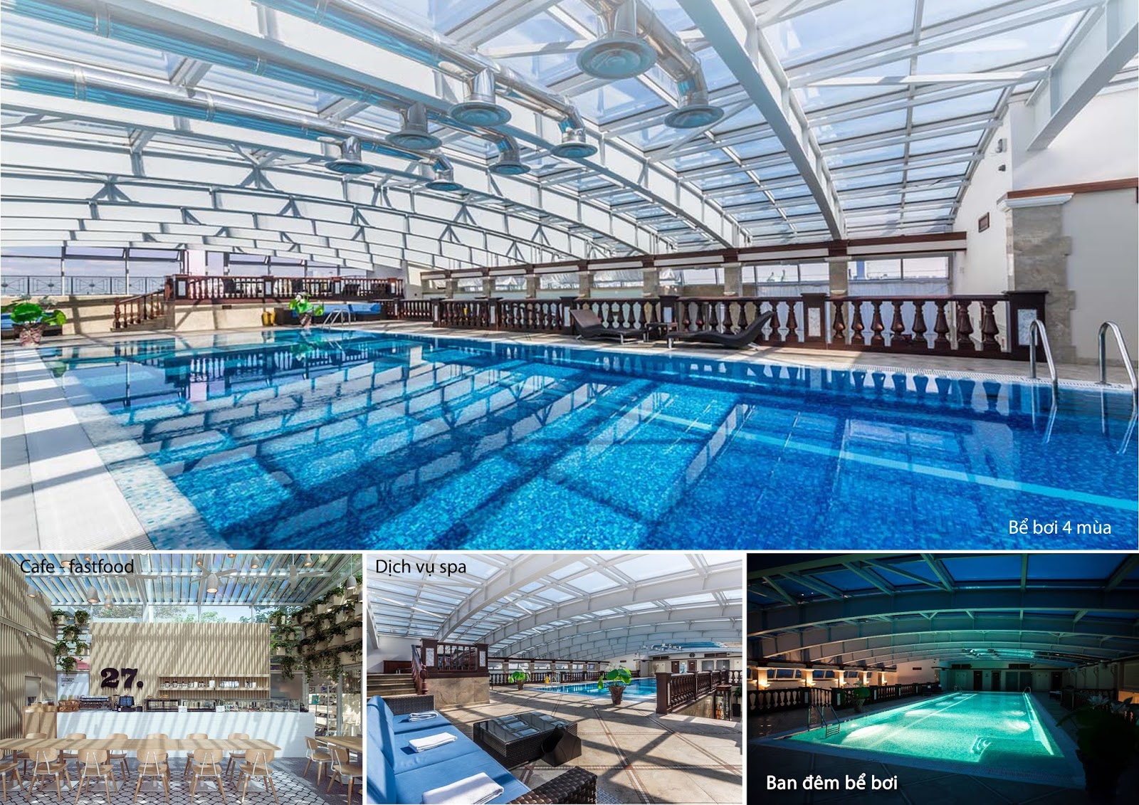 Bể bơi 4 mùa nằm ở hầm tầng 1 với mái vòm kính giúp cho cư dân thoải mái tận hưởng làn nước xanh mát mà vẫn vô cùng riêng tư. Không chỉ vậy, Bể bơi 4 mùa tại Sky Central Hoàng Mai sử dụng cộng nghệ lọc nước tiêu chuẩn, không sử dụng hóa chất nên tuyệt đối an toàn với sức khỏe.