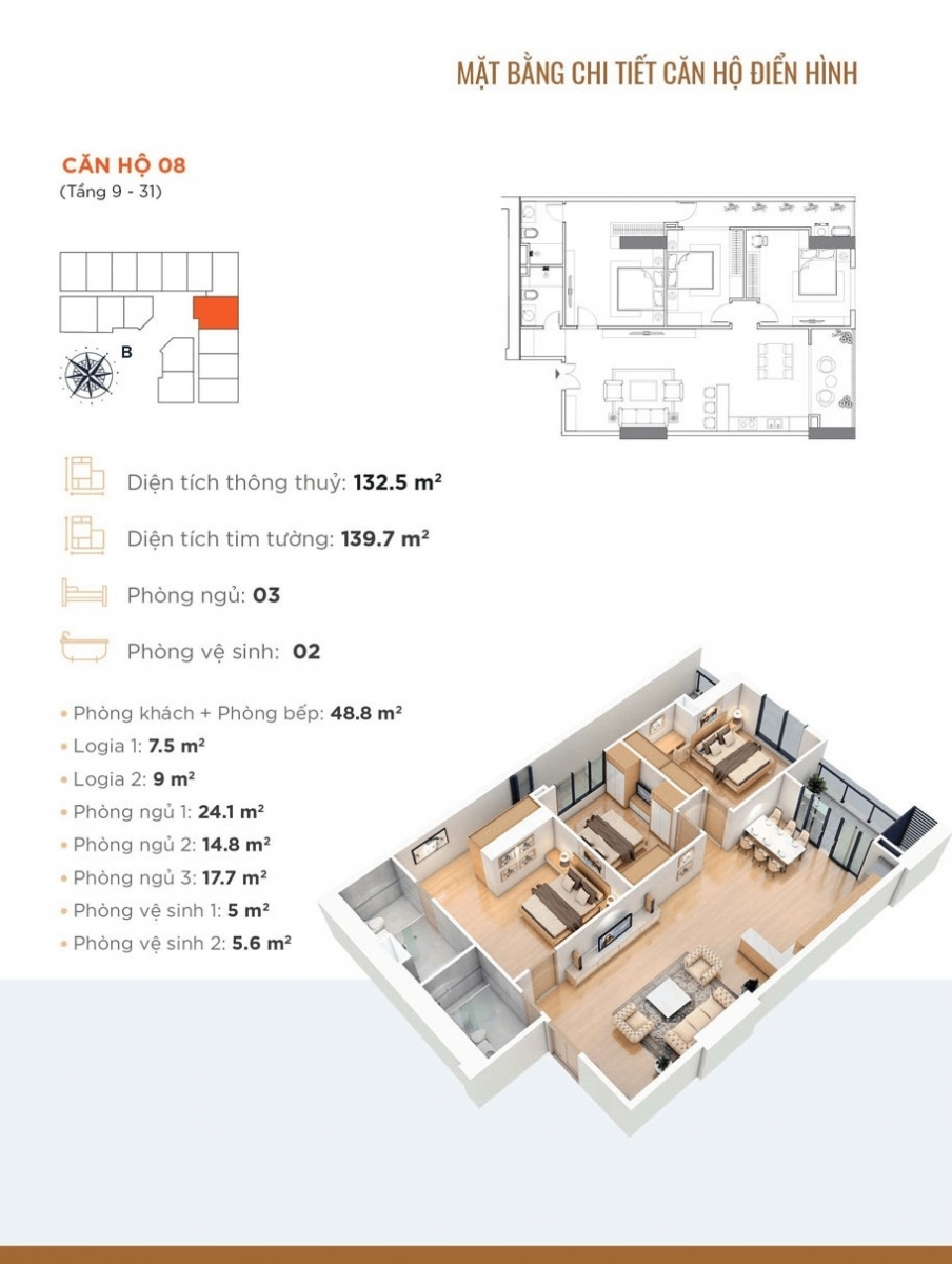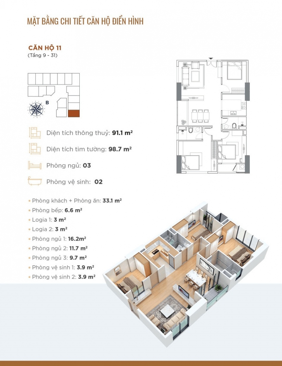 - Căn hộ 3 phòng ngủ: 95m2 - 98m2 - 100m2 - 116m2 - 132m2