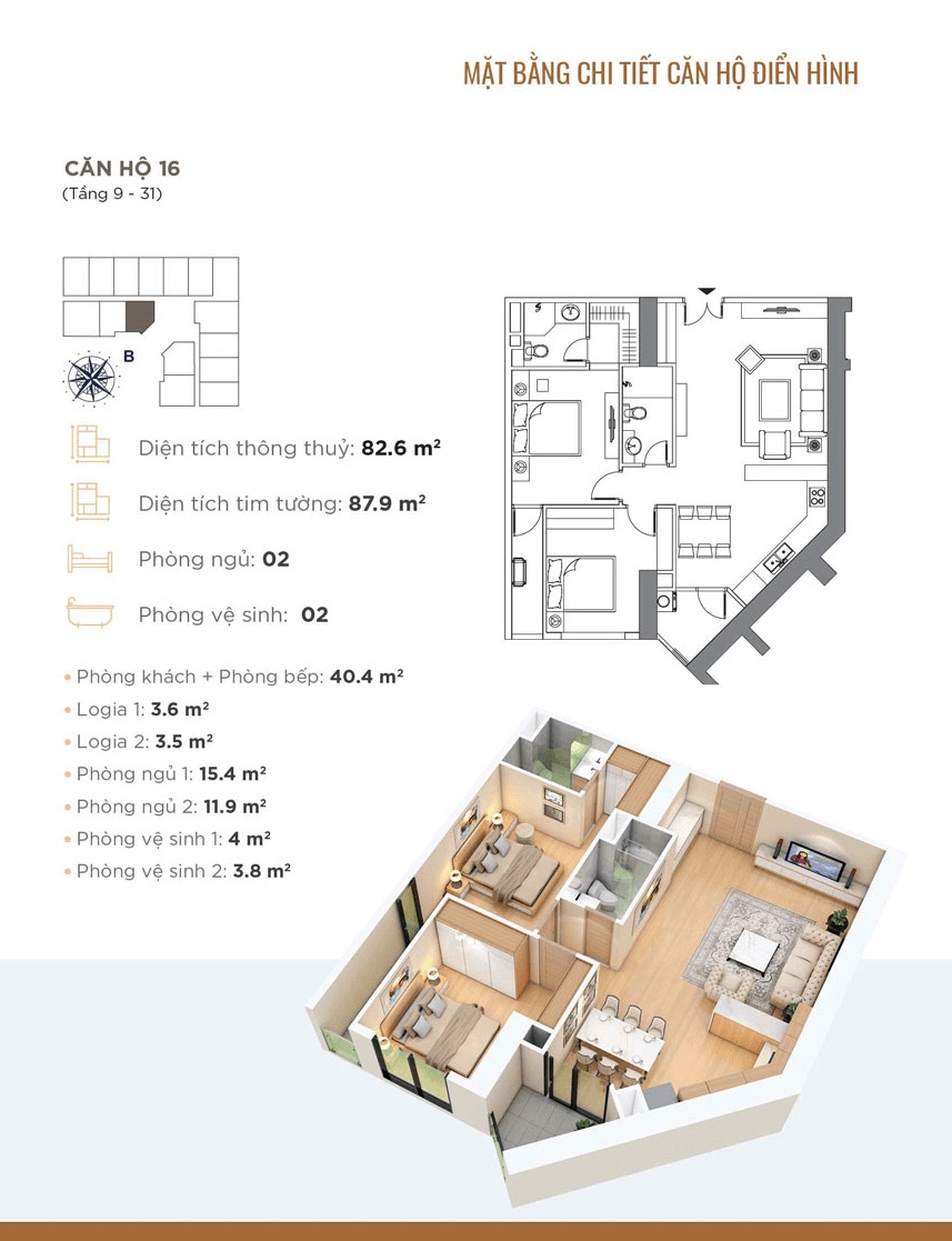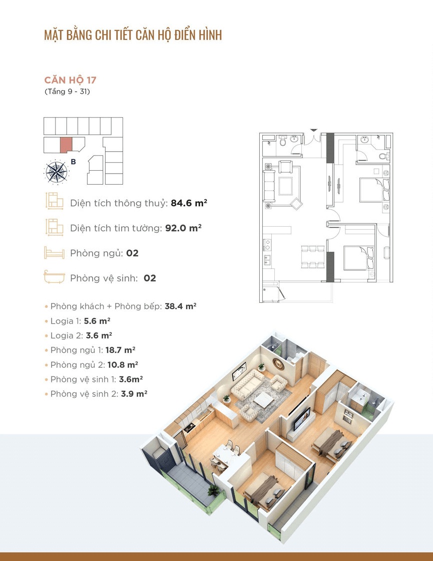 - Căn hộ 2 phòng ngủ: 82m2 - 84m2 - 91m2 - 95m2 - 98m2.
