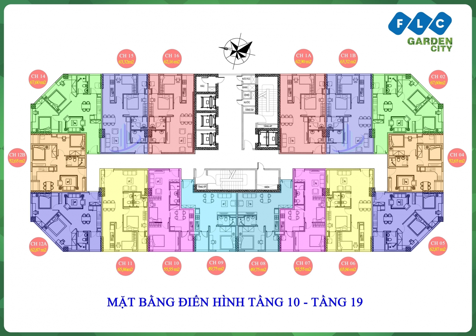 - Diện tích cụ thể: 46m2 - 49m2 - 50m2 - 52m2 - 55m2 - 58m2 - 66m2 - 70m2 - 73m2