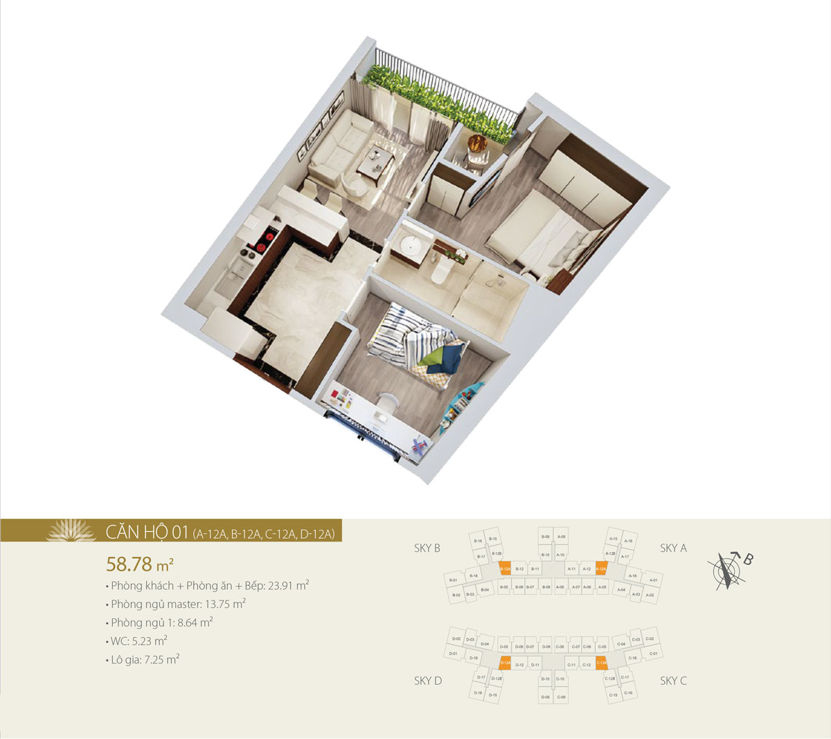 Mỗi tầng gồm 18 căn hộ (10 căn 2 phòng ngủ và 8 căn 3 phòng ngủ), có diện tích từ 57.91 – 105.21m2. Số lượng căn góc có 2 mặt thoáng nhiều, tầm nhìn bao quát sông Hồng và trung tâm thành phố.