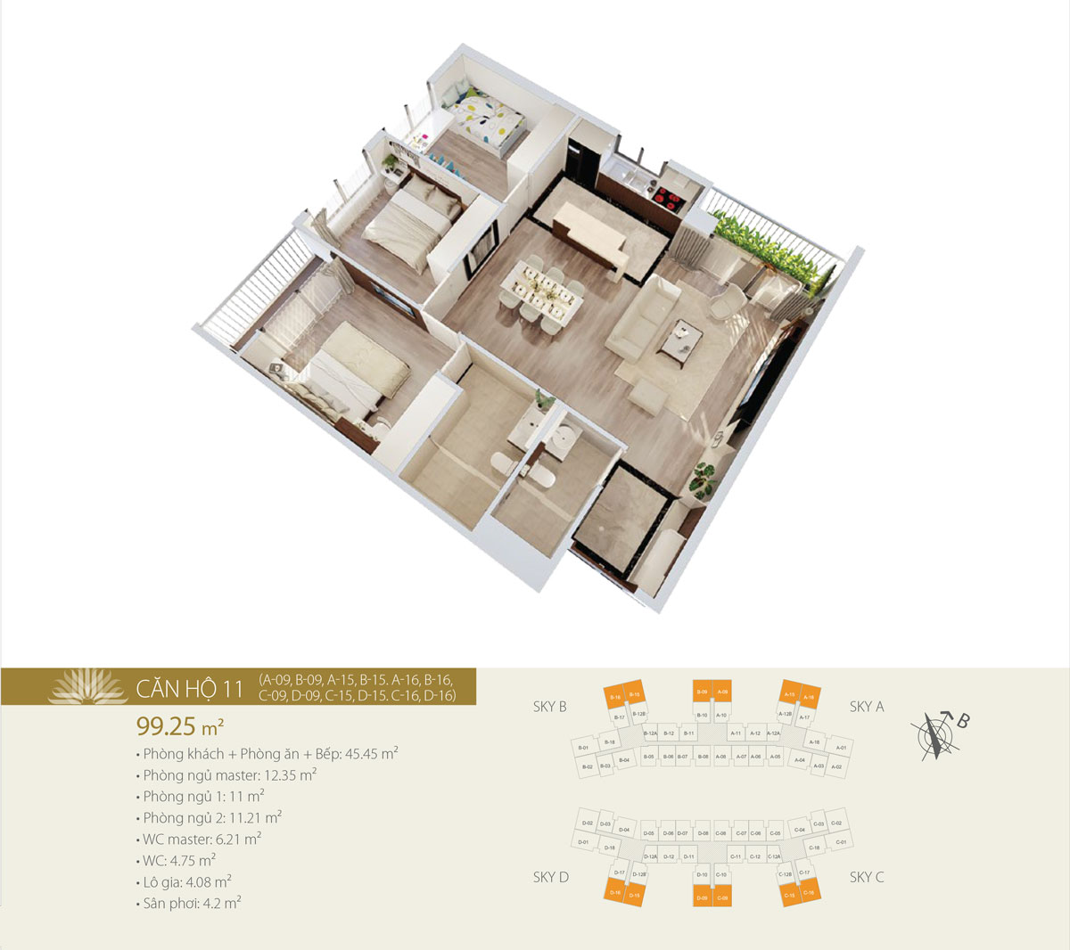 Diện tích thông thủy căn hộ: Từ 57,91m2 đến 105,21m2