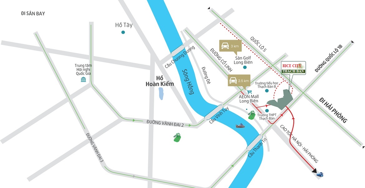 Cư dân của Nhà ở xã hội Hà Nội Garden City Thạch Bàn có thể di chuyển chỉ 5 phút lái xe đến AEON Mall và sân gôn Him Lam Long Biên. Đặc biệt, sau khi các cây cầu mới đi vào hoạt động thì việc di chuyển từ khu vực trung tâm đến quận Long Biên sẽ dễ dàng, thuận tiện hơn. Trước cơ hội lớn để trở thành một “thành phố ven sông” sôi động, Long Biên nhanh chóng lọt vào tầm ngắm của các đại gia. Trong ngành bất động sản, yếu tố “cận thị - cận giang - cận lộ” luôn là những tiêu chí hấp dẫn, đặc biệt khi cộng hưởng sự đầu tư đồng bộ vào giao thông và các hạng mục cơ sở hạ tầng tại khu vực.