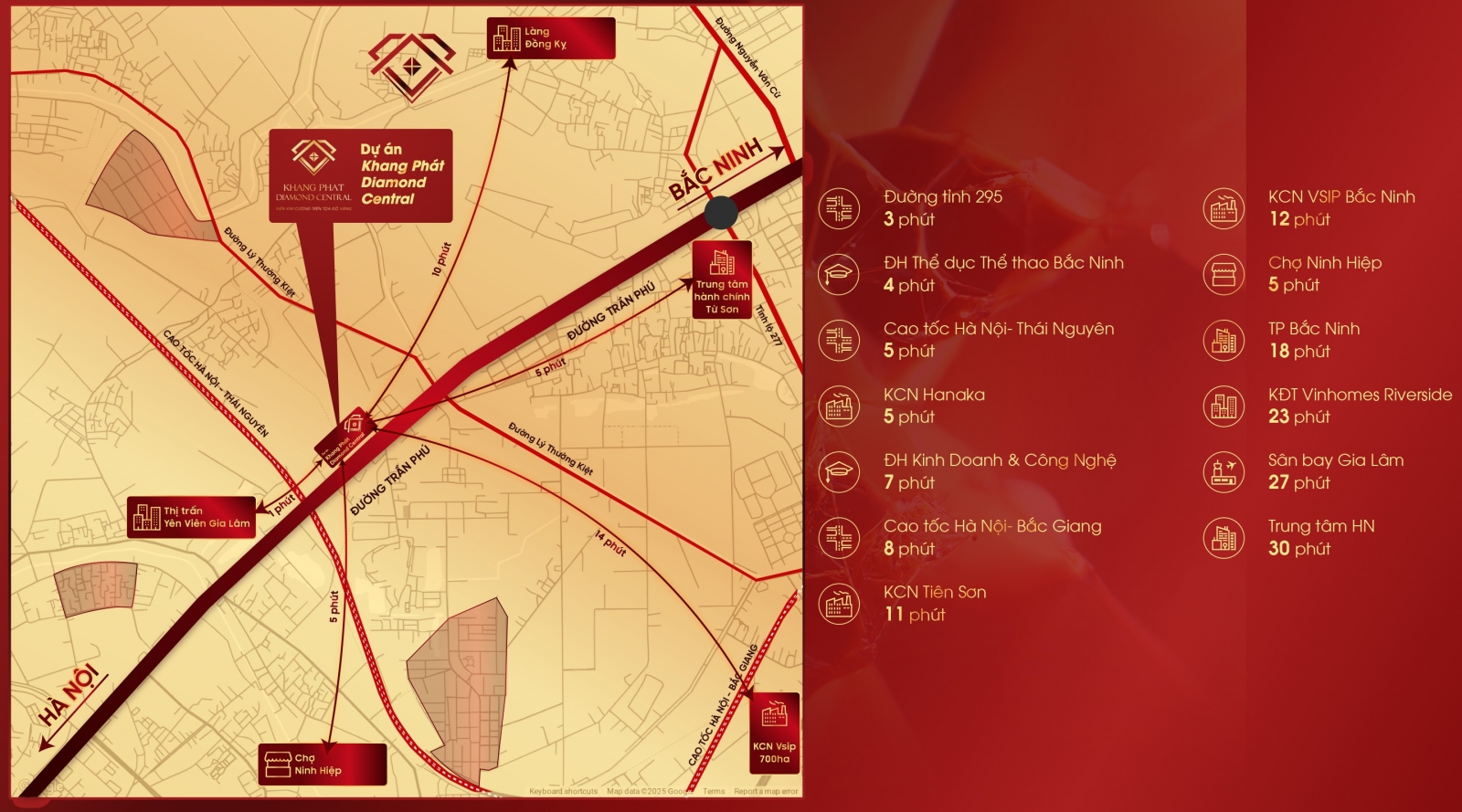 Khang Phát Diamond Central được bao quanh bởi các trục đường giao thông quốc gia lớn nối liền các trung tâm kinh tế, văn hóa và thương mại của phía Bắc như tuyến QL1A, QL 1B (cao tốc Hà Nội – Bắc Giang), TL 295B, TL 277 ...